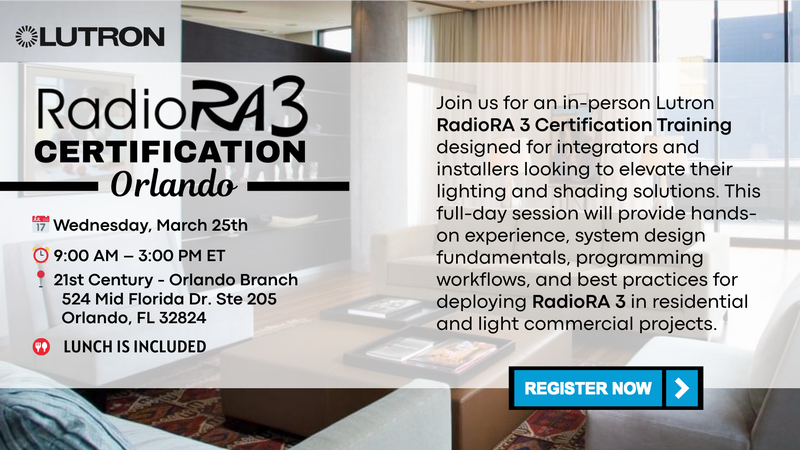 Lutron RadioRA 3 Certification Training - Orlando | Wednesday, March 25th | 9:00 AM – 3:00 PM ET